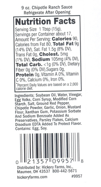 Toledo, Ohio – April 19, 2014Hickory Farms, Inc., the specialty food and holiday gift retailer today announced a voluntary recall of its Chipotle Ranch Sauce due to an undeclared allergen on its label. The Chipotle Ranch Sauce is formulated with buttermilk powder, a known allergen. However, the product was mistakenly released with a label that does not declare the presence of this milk allergen.