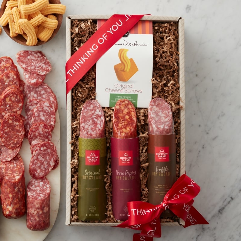This flight of our premium dry salami is a delicious way to let your college student know you’ve got them on your mind. This gift includes one each of our Original, Truffle, and Three Pepper Dry Salami, plus cheese straws and a “thinking of you” ribbon for a special touch.