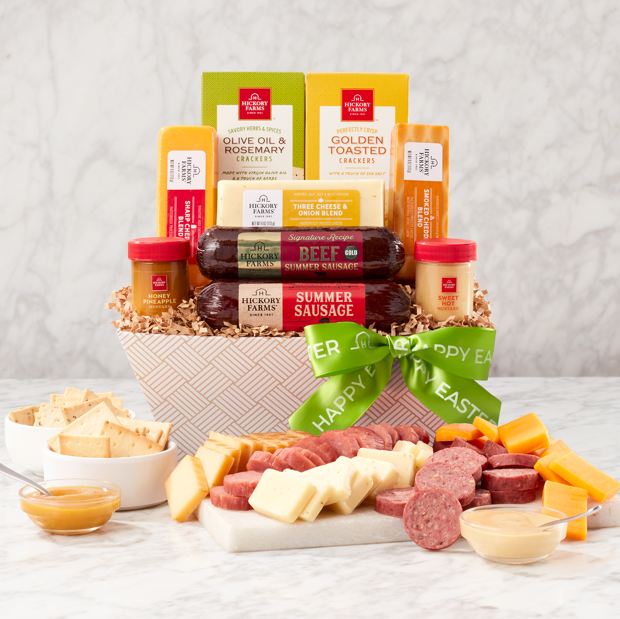 Hop into the Easter season with a basket full of our favorites. This savory Easter gift basket is a wonderful Hostess Gifts for the party planner in your life and makes a wonderful addition to any spring gathering. Inside you’ll find an assortment of three cheeses, two sausages, two mustards, and two kinds of crackers—perfect for countless flavor combinations.