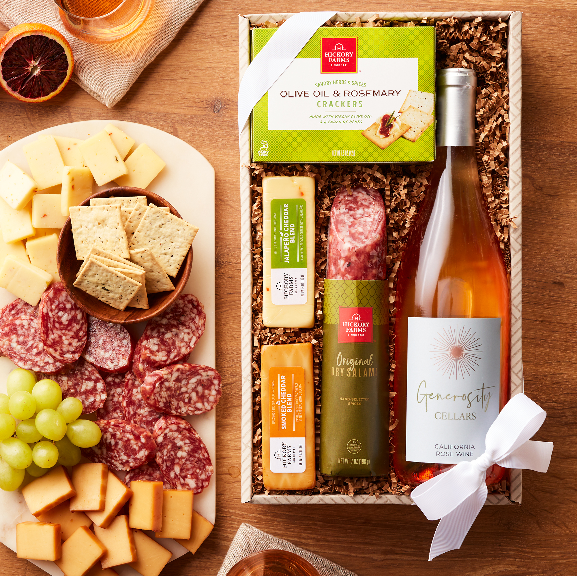 Looking for Easter gifts for adults? Send the wine lover in your life this collection of savory flavors, perfect for pairing, sharing, and celebrating. Start with rich Original Dry Salami, complemented by bold Jalapeño Cheddar and smooth Smoked Cheddar Blend cheeses. Add Olive Oil & Rosemary crackers for the perfect savory balance and serve alongside Generosity Cellars California Rosé for a sophisticated bite.