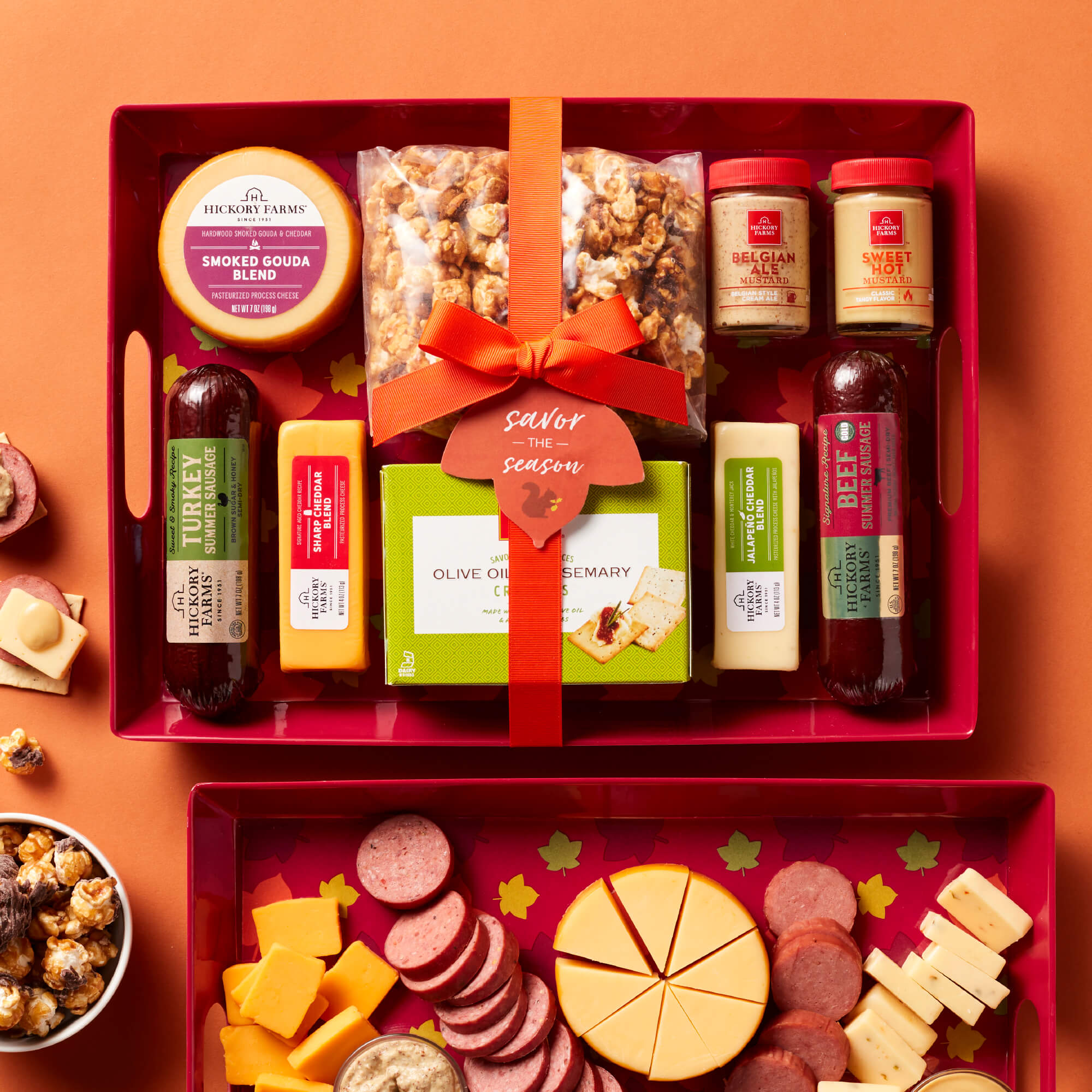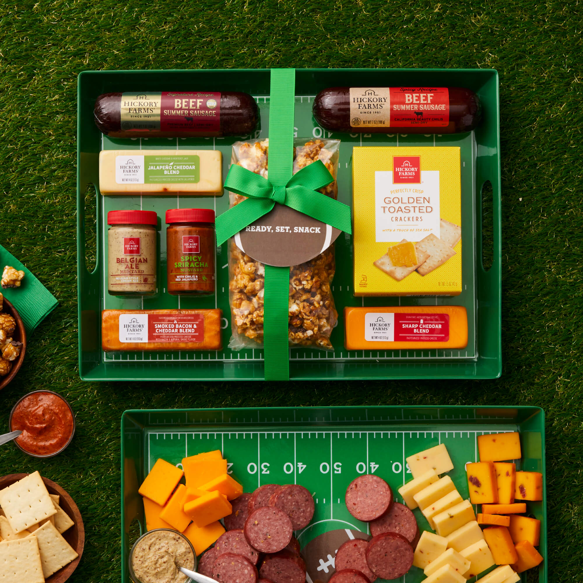 Give the gift of a game day party! This gift set features a dishwasher-safe, reusable melamine serving tray in a fun football print perfect for their watch parties and tailgates. This gift pairs Hickory Farms favorites like Signature Beef and Spicy Beef Summer Sausages, Sharp Cheddar Blend, Jalapeño Cheddar Blend, Bacon & Smoked Cheddar Blend, Spicy Sriracha and Belgian Ale Mustards, and Golden Toasted Crackers to create bites with a big kick of flavor. The Chocolate Caramel Corn adds a sweet touch to this touchdown-worthy gift.