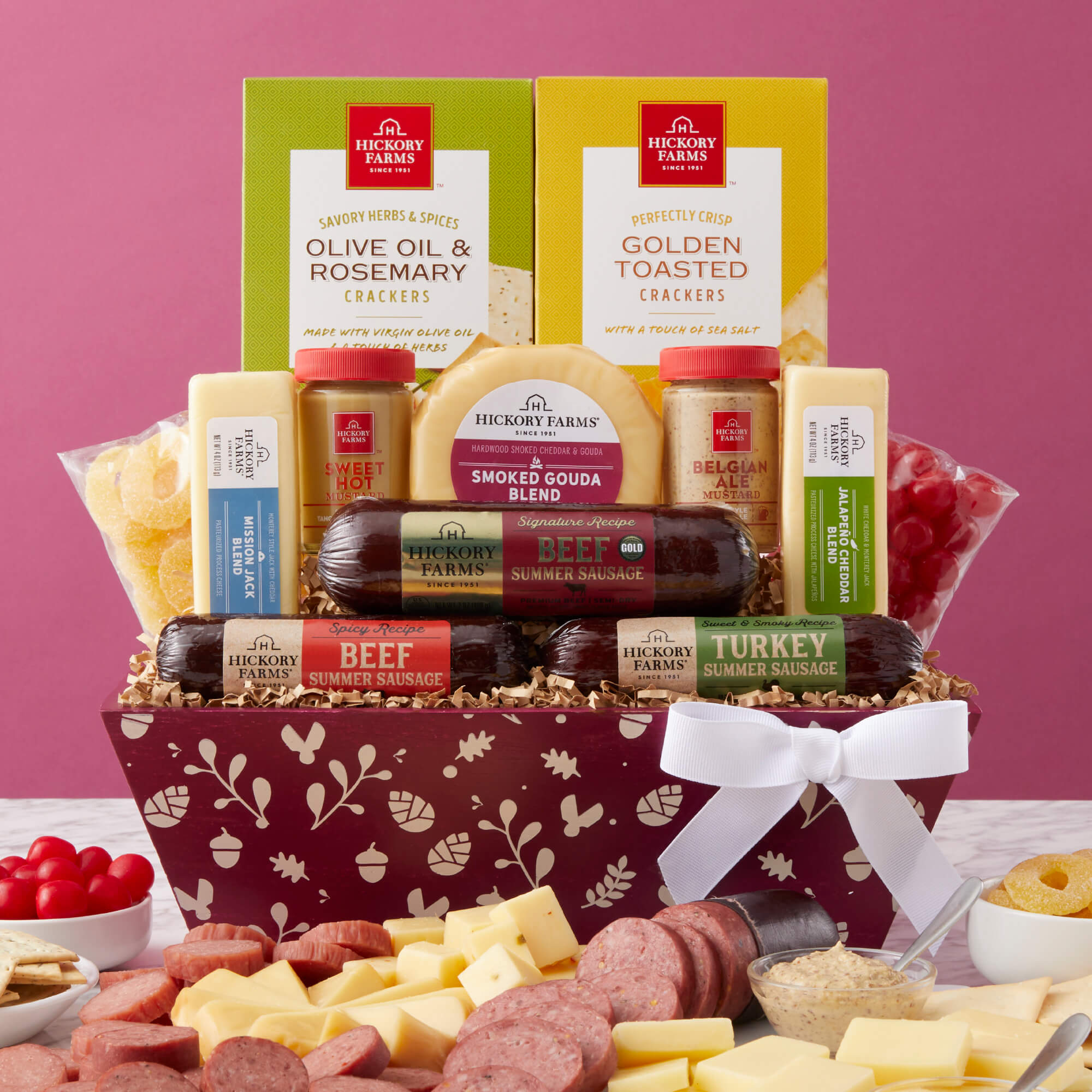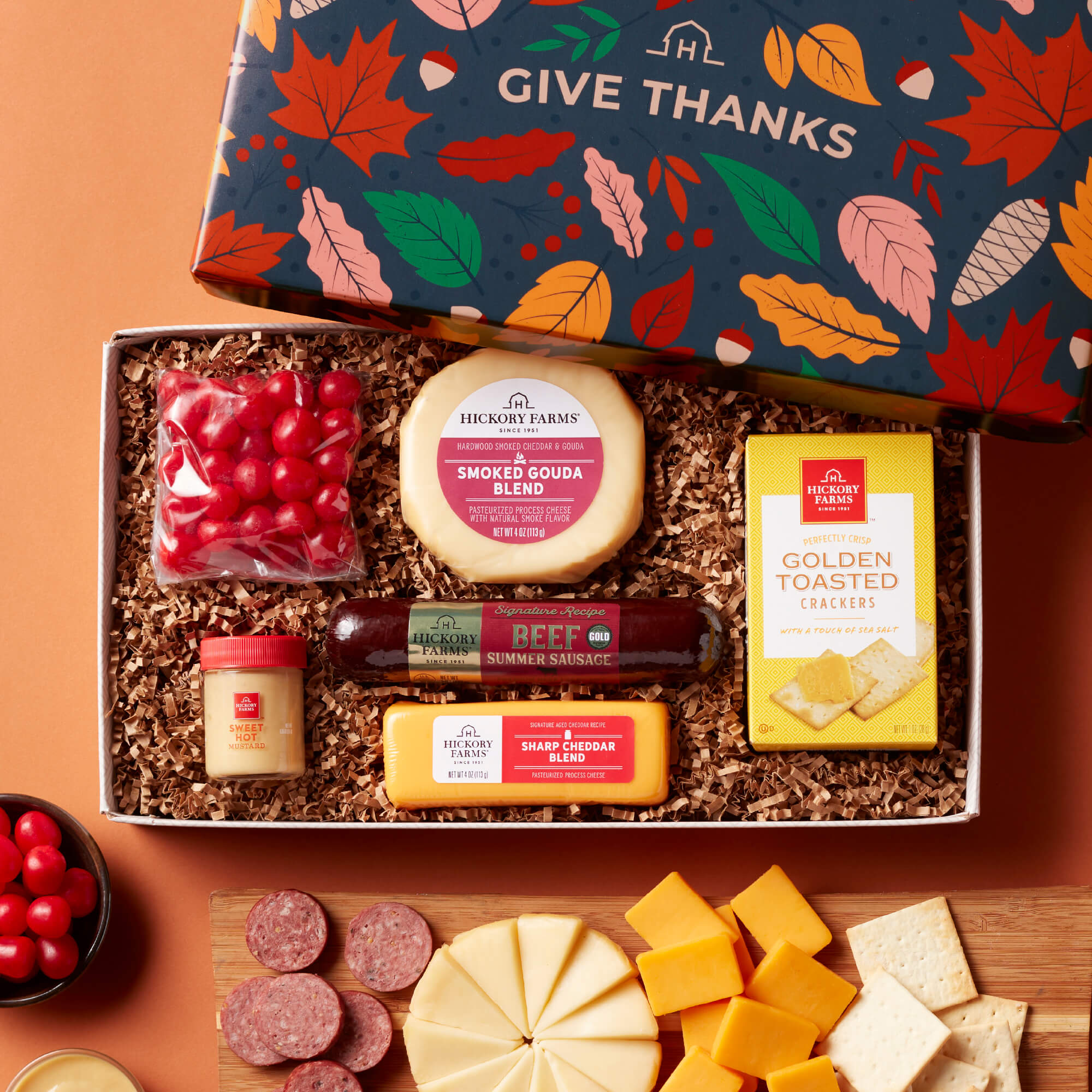 Celebrate any fall occasion by sending a harvest gift basket filled with savory bites! Our Premium Harvest Flavors Gift Basket features an array of summer sausages, cheeses, delightful condiments like our Belgian Ale and Sweet Hot Mustards, and Golden Toasted and Olive Oil & Rosemary Crackers to create the perfect fall charcuterie spread. Cherry Sours, Pineapple Rings, and a fall hangtag add the perfect autumn touches to this gift!