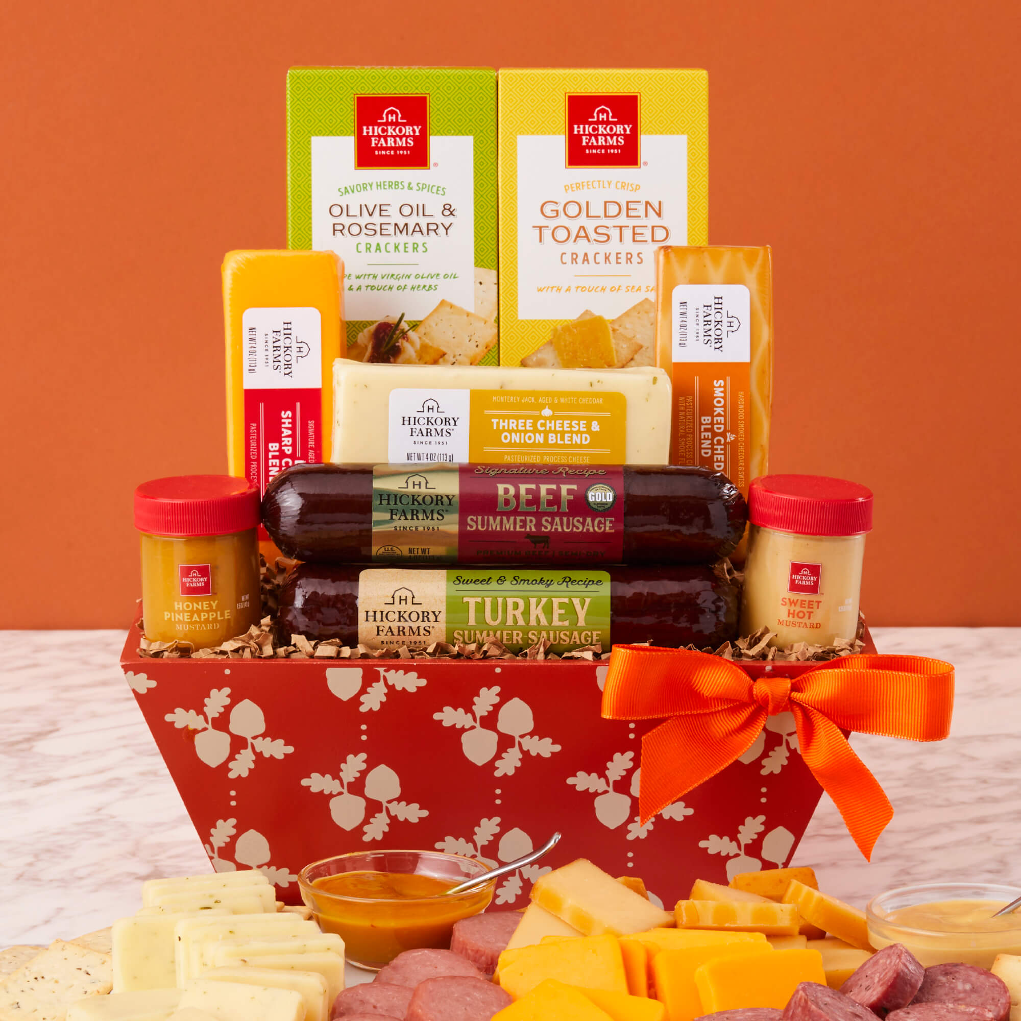 Let them know you care by sending a thoughtful taste of autumn with our Fall Flavors Gift Basket! This gift basket is filled with savory flavors like Sweet & Smoky Turkey Summer Sausages, Smoked Cheddar Blend, Sharp Cheddar Blend, Three Cheese & Onion Blend, Honey Pineapple and Sweet Hot Mustards, and Golden Toasted and Olive Oil & Rosemary Crackers that all pair deliciously for a gourmet meat and cheese spread.