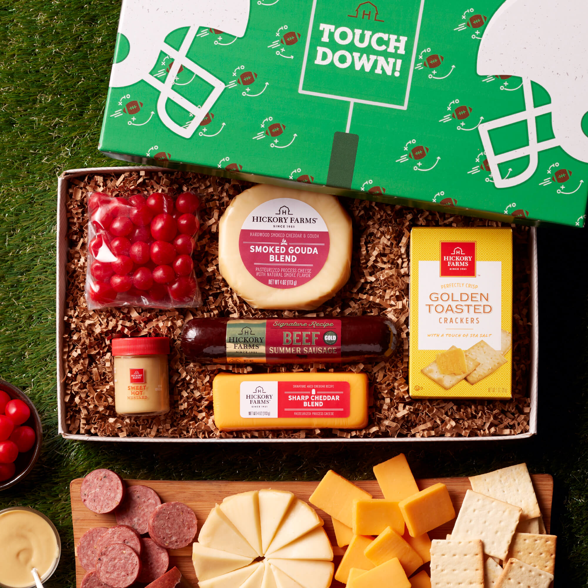 Game Day calls for snacks that score serious points. Treat the football lover on your list to this gift box filled with Signature Beef Summer Sausage, Sharp Cheddar Blend, Smoked Gouda Blend, Sweet Hot Mustard, and Golden Toasted Crackers, plus Cherry Sours. The specially-designed football box adds a touch they'll cheer for!