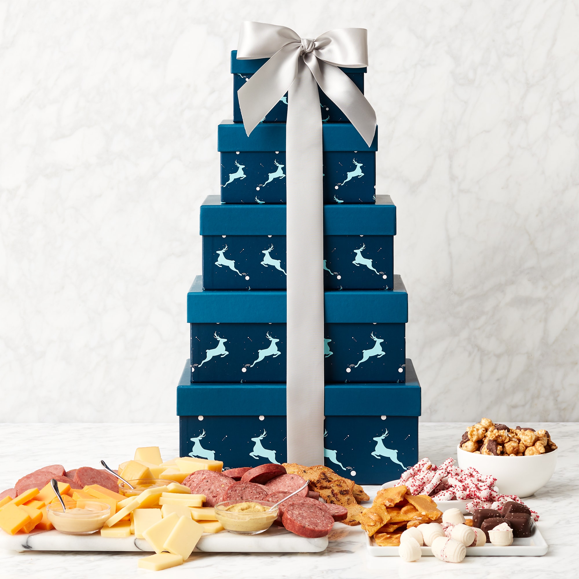 Send an impressive collection of holiday treats with this gift tower that includes five signature designed boxes tied with a beautiful bow. Tucked inside are savory favorites like our Signature Beef and Sweet & Smoky Turkey Summer Sausages , and a collection of our favorite cheeses and mustards. For something sweet, treats like Chocolate Caramel Corn and Holiday Jelly Mix finish this gift, making it something unforgettable.