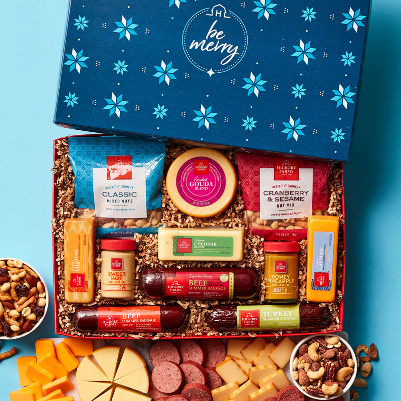 Send an impressive collection of delicious holiday treats with this gift box featuring our signature holiday design. Tucked inside are savory favorites like our Signature Beef , Spicy Beef , and Sweet & Smoky Turkey Summer Sausages , and a collection of our favorite cheeses like our Smoked Gouda Blend . The Classic and Cranberry & Sesame Nut Mixes round out the flavors with something sweet and salty. And this gift also gives back with a $5 donation No Kid Hungry , making it extra meaningful.