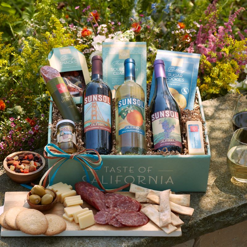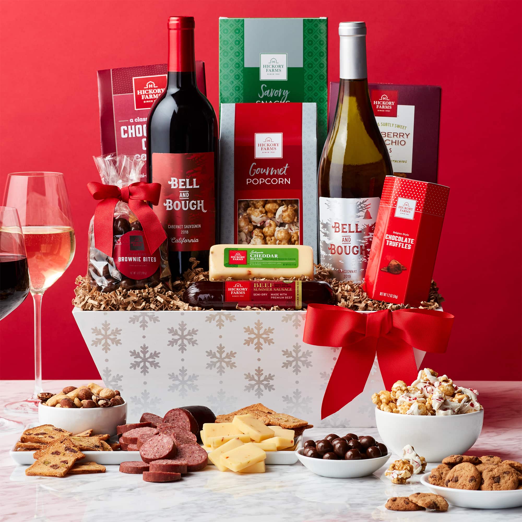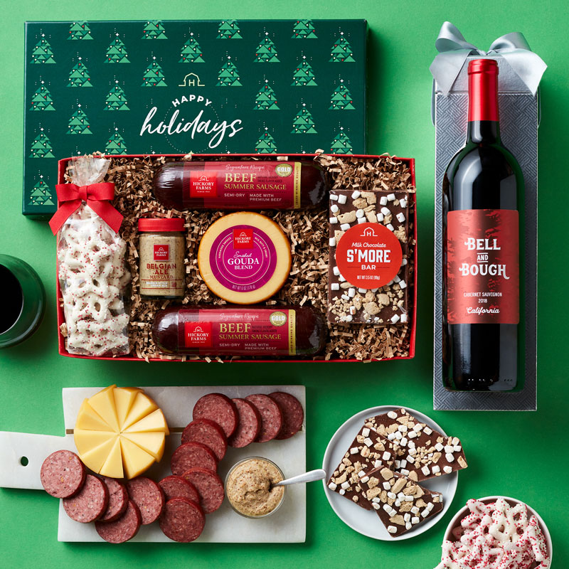 Celebrate the holiday season by sharing this collection of sophisticated snacks and wine. Original Dry Salami, Smoked Cheddar Blend, Jalapeño Cheddar Blend, and Olive Oil & Rosemary Crackers all pair perfectly for a savory bite. Bell & Bough California Cabernet Sauvignon and a Happy Holidays ribbon add a festive touch.
