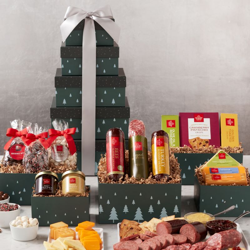What’s better than opening a gift on Christmas? Opening four gifts in one! This tower features an assortment of Hickory Farms classics beautifully packed in jolly holiday boxes. Classic flavors like Signature Beef, Spicy Beef, and Sweet & Smoky Turkey Summer Sausages, Farmhouse Cheddar, and Spreadable Pepper Jack all pair deliciously to create endless bold, savory flavor combinations.