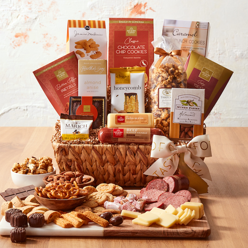 Our favorite flavors make the best gift for the holidays! This meat and cheese gift basket is filled with our well-loved Signature Beef Summer Sausage, four of our best-selling cheeses, Sweet Hot and Belgian Ale Mustards, plus two types of crackers to stack up delicious, savory bites. Our favorite decadent sweets like Dark Chocolate Peanut Butter Meltaways, Dark Chocolate Sea Salt Caramels, and Chocolate Covered Pretzels finish this gift off beautifully.
