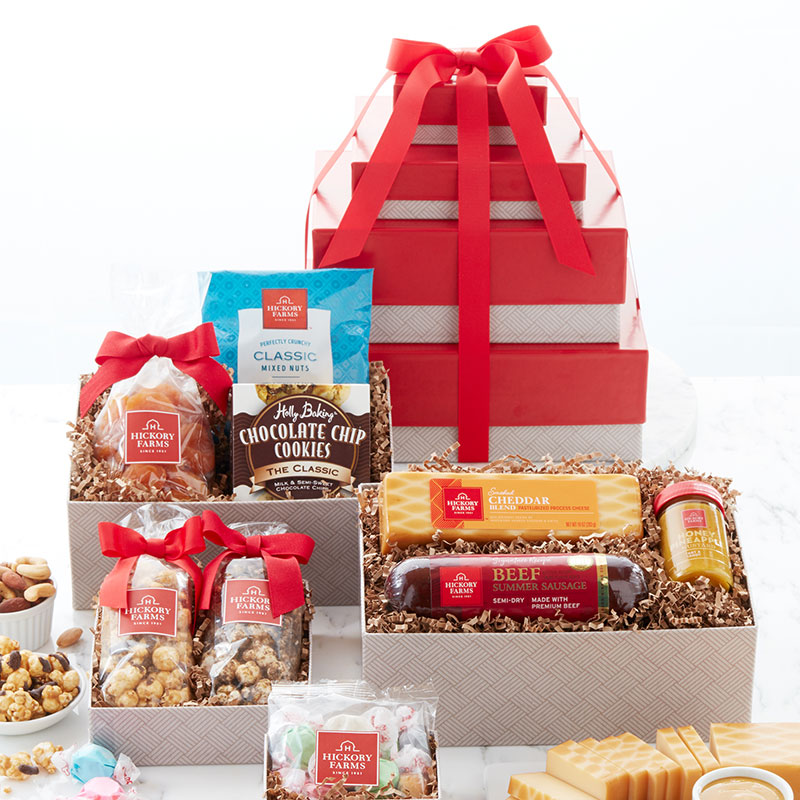 This towering collection of treats features Hickory Farms favorites, plus delicious sweets and snacks that’s perfect for celebrating your graduate! Signature Beef Summer Sausage, Smoked Cheddar Blend, Sweet Hot Mustard, plus an assortment of nuts, dried fruit, cookies, popcorn, and saltwater taffy will have guests coming back for more.