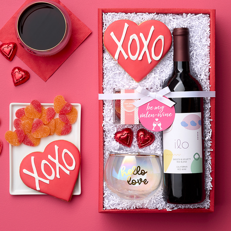 This elegant little box will surprise your lucky lady even more than a box of flowers. The gift set features rich Ilo California Red Blend she can sip from her Hello Love Stemless Wineglass. Then, the Sour Peach Hearts, XOXO Sugar Cookie, and Chocolate Hearts will remind her of all the sweet memories you’ve made together.