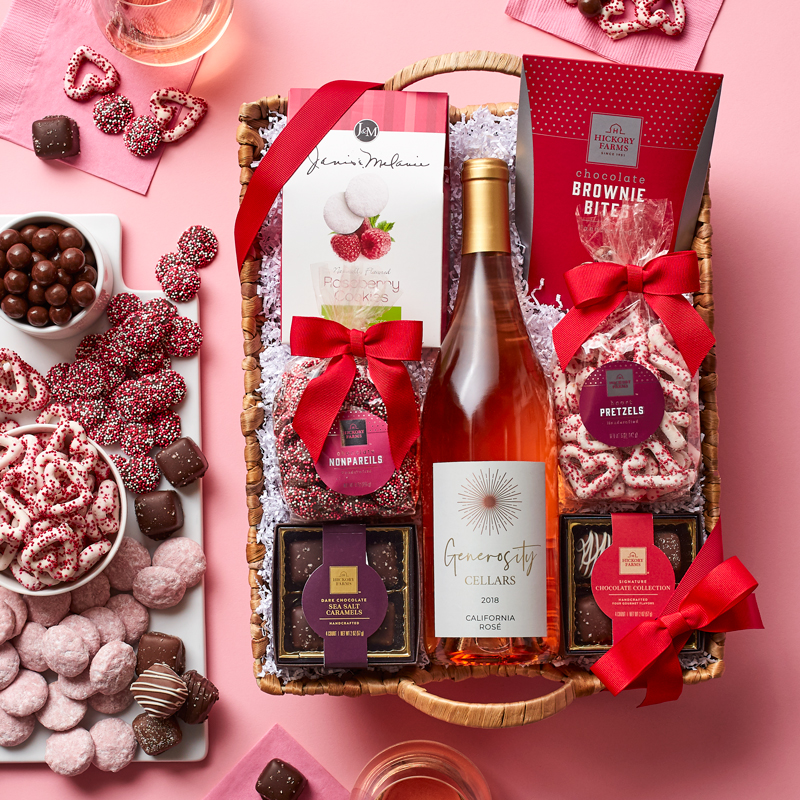 The best way to her heart this Valentine's Day? A wine gift basket! This one features our most popular meats and cheeses to enjoy alongside a glass of delicious Generosity Cellars California Cabernet Sauvignon or Rosé. She can top it all off with an array of sweets like Chocolate Nonpareils, Confetti Popcorn, Chocolate Chip Cookies, and Heart Pretzels. Finally, the signature-designed basket and Valentine's Day ribbon add a lovely touch she'll fall head over heels for.
