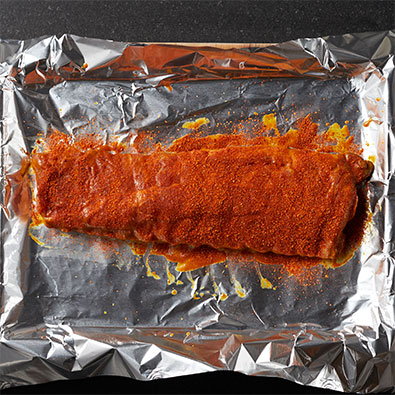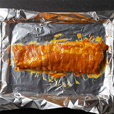 2. Place a double thickness of heavy foil cut 6 inches longer than the rack of ribs on a baking sheet. Place ribs in the middle of the sheet and wrap with the foil. Bake for 1 ½ to 2 hours or until tender (the two middle bones of the rack should start to pull apart easily).