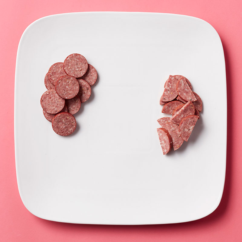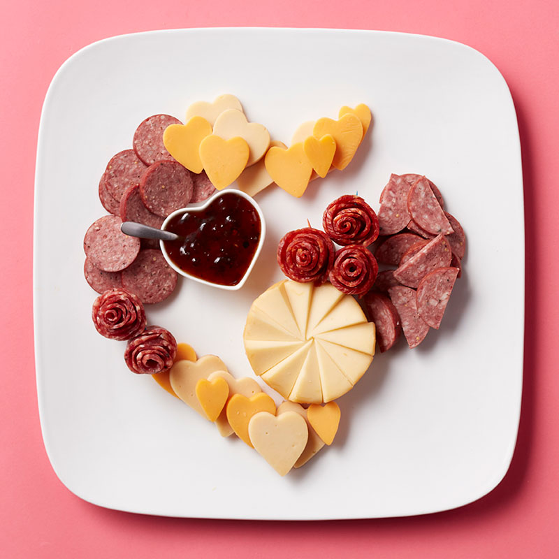 Start with award-winning Signature Beef Summer Sausage. Slice rounds for the upper left side of the heart shape and half-moon slices for the right side of the heart. This lets you determine how wide you want your heart shape to be on your platter or board.