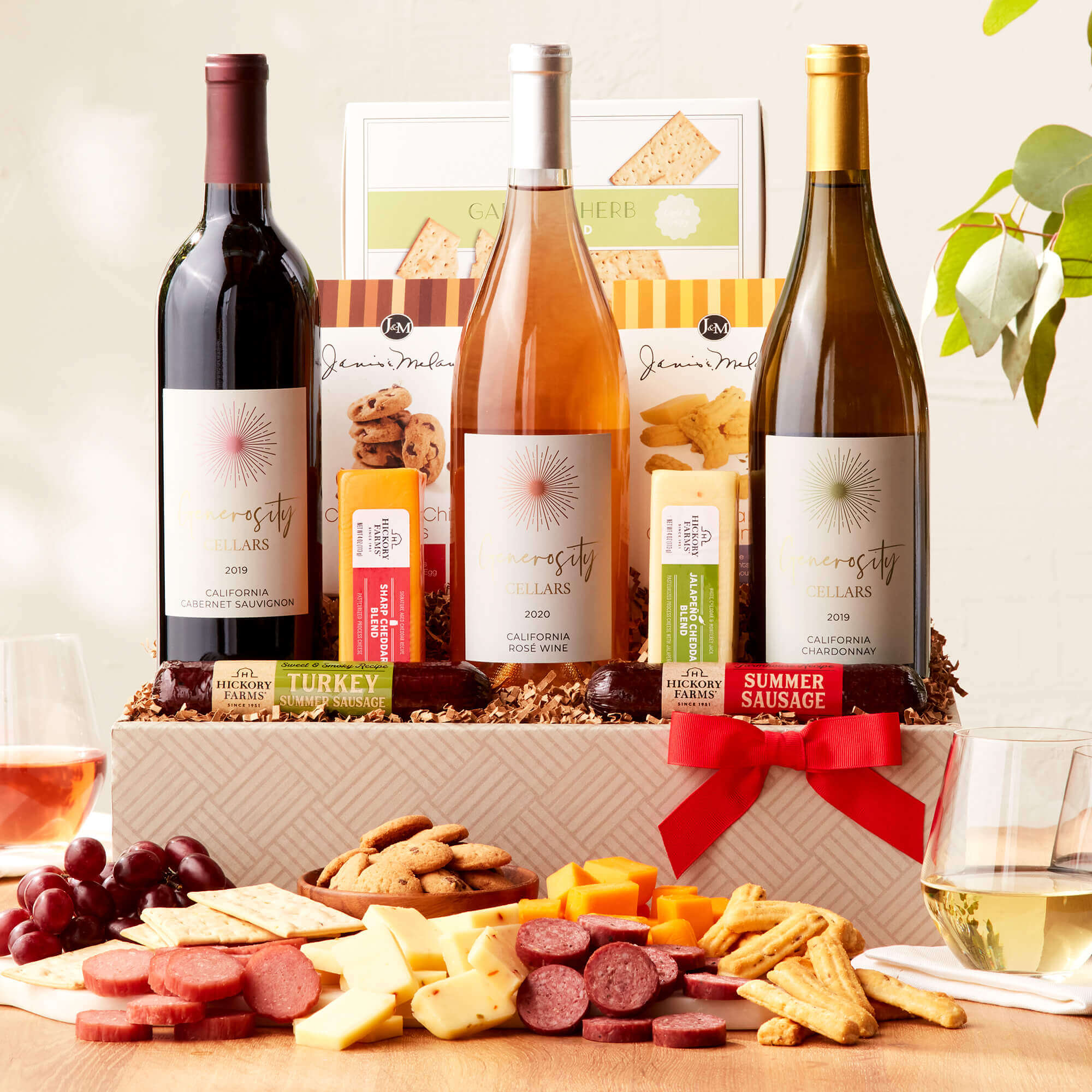 Give the gift of savory snacks perfectly paired with wine. This generous gift basket is overflowing with sweet and savory flavors to create plenty of delicious bites. It includes our Farmhouse and Sweet & Smoky Turkey Summer Sausages, Jalapeño Cheddar Blend, Sharp Cheddar Blend, Sweet Hot Mustard, and Garlic & Herb Flatbread to stack up savory combinations. J&M Gouda Cheese Straws and J&M Chocolate Chip Cookies add extra flavor to this assortment. Everything inside this gift basket tastes delicious when enjoyed with the crisp Generosity Cellars California Chardonnay, rich Cabernet Sauvignon, and fruity Rosé.