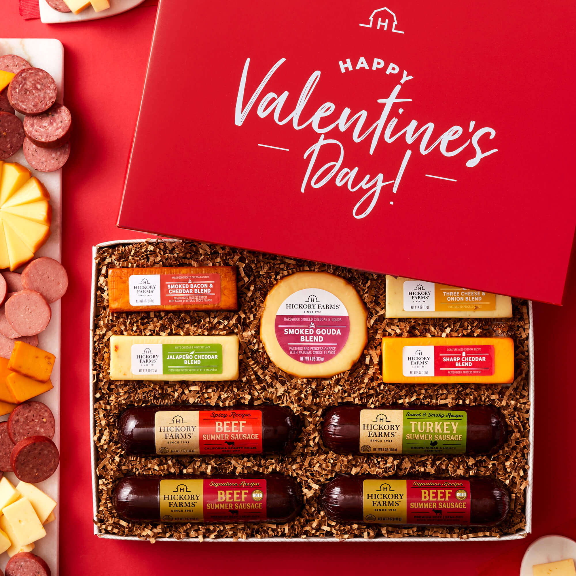 Wish your special someone a happy Valentine's Day with this gift box filled with their favorite flavors! This meat and cheese gift features Signature Beef, Spicy Beef, and Sweet & Smoky Turkey Summer Sausages that pair deliciously with Sharp Cheddar Blend, Jalapeño Cheddar Blend, Smoked Gouda Blend, Three Cheese & Onion Blend, and Bacon & Smoked Cheddar Blend for a wide variety of flavor. The Valentine's Day box makes this gift extra special. And because it’s gluten-free, this gift makes a great pick that almost anyone can enjoy!