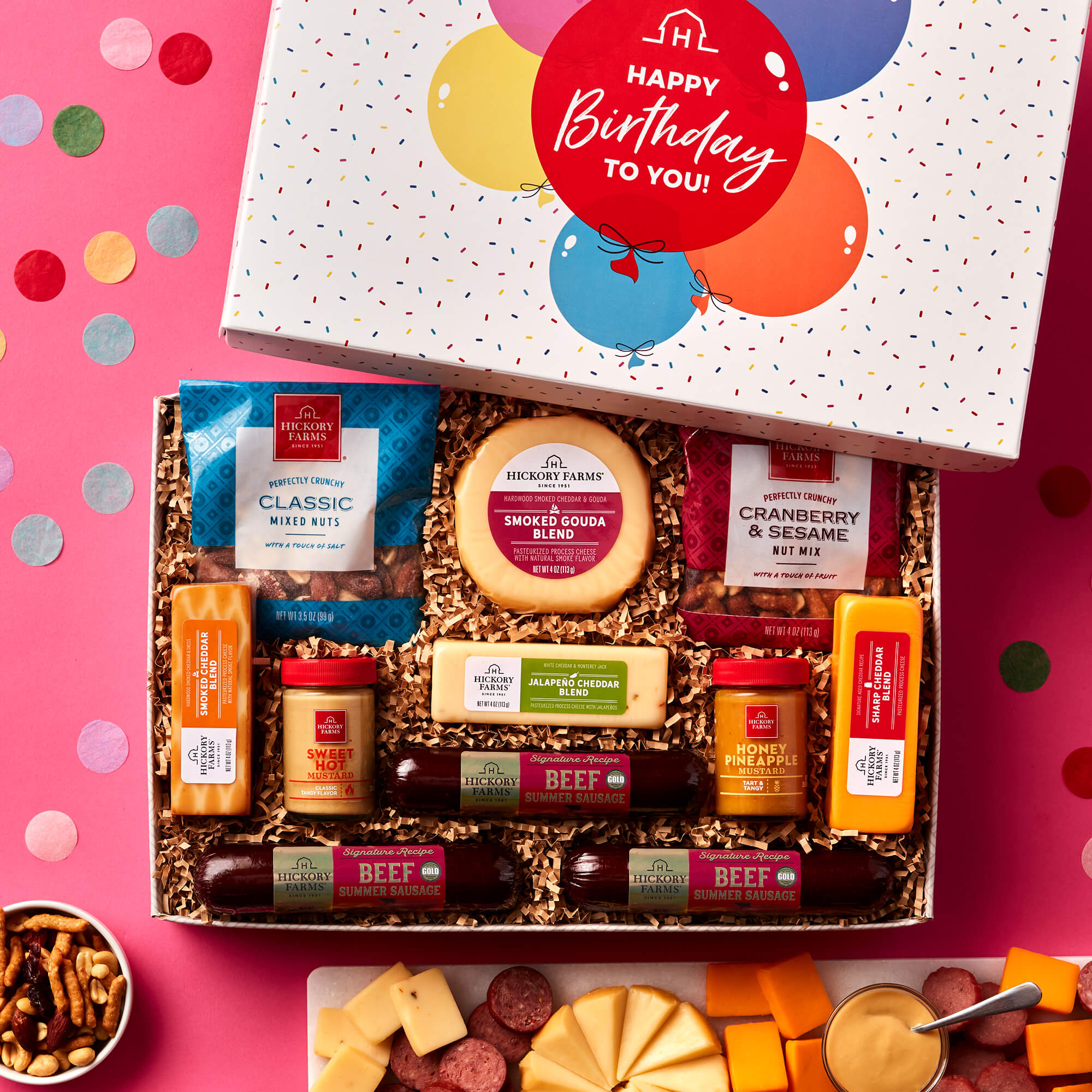 Say happy birthday with a gift that's filled with an assortment of our award-winning sausages and cheeses! This meat and cheese gift box features Signature Beef Summer Sausage alongside creamy cheeses like Smoked Gouda Blend, Sharp Cheddar Blend, Jalapeño Cheddar, and Smoked Cheddar Blend, plus two of our favorite mustards. All of these flavors pair perfectly with the sweet and salty flavors of the Classic and Cranberry & Sesame Nut Mixes for a little delicious crunch. The signature designed happy birthday box adds a special touch.
